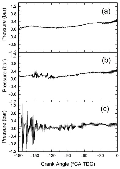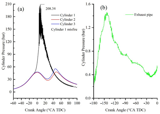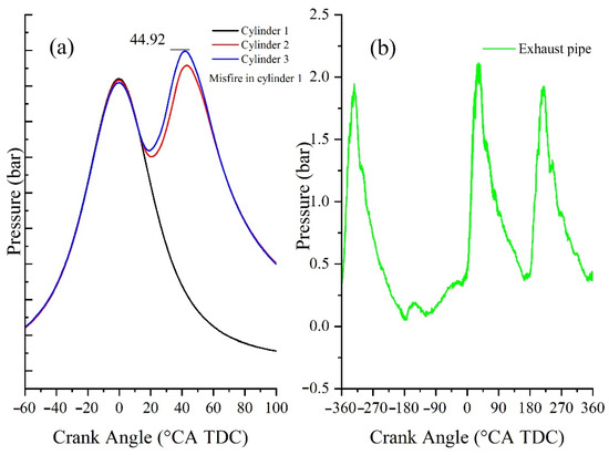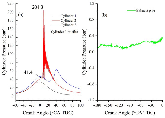 Misfire in cylinder 1 would also cause super-knock in cylinder 2. Figure 18 shows the pressure curves of the three cylinders and exhaust pipe when cylinder 1 misfired. The corresponding operating conditions were 2000 r/min and WOT. In Figure 8a, cylinder 1 misfired, and cylinder 2 had a super-knock. The Pmax of cylinder 2 could reach 204.3 bar, accompanied by severe pressure oscillations. Compared with normal combustion, the peak pressure of super-knock was more than four times higher. The strong detonation wave quickly swept over the pressure transducer, causing the corresponding cylinder pressure to rise rapidly from 41.4 to 204.3 bar, and the pressure amplitude reached 162.9 bar, causing serious pressure “discontinuity”. This result indicated that misfires in cylinder 1 caused super-knock in cylinder 2. The exhaust stroke of cylinder 1 corresponded to the intake stroke of cylinder 2.
