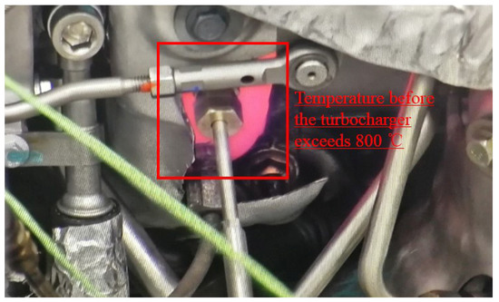 Figure 15 shows three different types of exhaust pressure fluctuations at 1700 r/min and WOT. The exhaust pressure was collected by the fourth channel of the AVL combustion analyzer (the system defaults to the pressure of cylinder 4), and the crankshaft angle range from −180 °CA to 0 °CA was the pressure fluctuation generated by the exhaust pulse of cylinder 1. In general, if cylinder 1 misfired, the mixture in the cylinder was not burned, the exhaust pressure was low, and there was no obvious pressure fluctuation, as shown in Figure 15a. At low speed and full load, the exhaust pipe presented a red hot state with the temperature high to 800 °C before the turbocharger, as shown in Figure 16. Therefore, when cylinder 1 misfired, the unburnt mixture discharged from cylinder might be ignited, or even deflagrated in the exhaust pipe. The pressure fluctuations caused by the combustion of the mixed gas in the exhaust pipe were captured in Figure 15b,c. Especially in Figure 15c, the amplitude and frequency of the pressure oscillations were higher.
