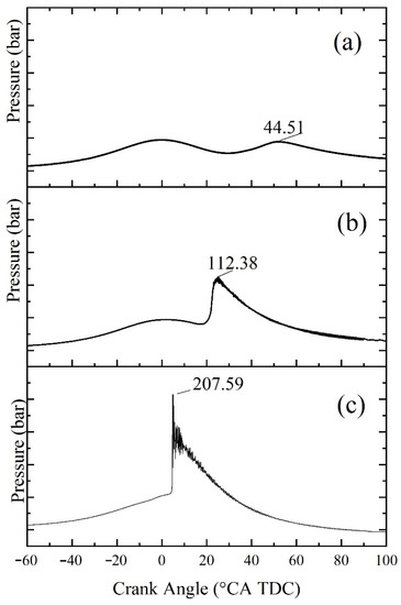 The in-cylinder pressure curves of cylinder 3 corresponding to the abovementioned different exhaust pressure oscillations are shown in Figure 17. It can be seen from Figure 17 that when the exhaust pressure did not fluctuate significantly (Figure 15a), the mixture in cylinder 3 burned normally (Figure 17a). When the exhaust pressure fluctuated slightly (Figure 15b), cylinder 3 had a moderate knock (Figure 17b). When the exhaust pressure fluctuated sharply (Figure 15c), super-knock occurred in cylinder 3 (Figure 17c). From the above results, it could be inferred that the knock of cylinder 3 was related to the combustion state of the unburned mixture of cylinder 1 in the exhaust pipe. The sharper the pressure fluctuation, the greater the intensity of knock in cylinder 3. According to the pressure oscillation characteristics of Figure 15c, it could be inferred that a strong pressure wave was generated in the exhaust pipe. According to existing studies [18], its oscillation characteristics were similar to detonation waves, but because the acquisition frequency was low, only 10,200 Hz (1700 r/min, once every 0.1 °CA), no higher pressure peaks were acquired, and the acquisition frequency of detonation waves ordinarily required up to 1 MHz. However, the above results can at least conclude that the abnormal pressure fluctuation in the exhaust pipe was strongly correlated with the occurrence of super-knock in the power cylinder corresponding to the misfired cylinder.