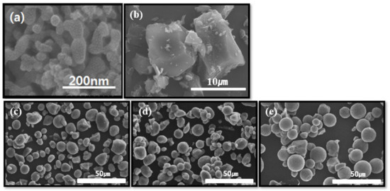 SEM images of (a) nano silicon, (b) hard carbon, (c) HSC, (d) HSBC, and (e) HSBGC.