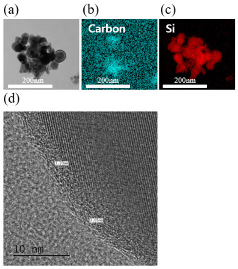 TEM micrographs; (a) image of SCB, (b,c) corresponding elemental mapping of carbon and silicon, (d) HRTEM image.