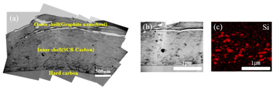 The cross-sectional TEM images of the composite HSBGC (in Figure 4) further confirm the dispersion of n-Si particles in the carbon matrix (in the inner shell) and the formation of the outer shell through encapsulation with the graphite nanosheets.