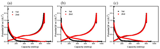 The electrochemical tests were carried out using a coin-type cell (CR2032, Wellcos Co., Ltd., Gunpo-si, Korea). The coin cells were assembled in an argon-filled glove box with lithium foil as the counter electrode and 1M LiPF6 in ethylene carbonate (EC) diethyl carbonate (DEC) (1:1 by volume) as the electrolyte. The working electrodes were made by spreading an aqueous slurry containing 85 wt% active material, 5 wt% super P and 10 wt% binder (polyacrylic acid) onto a Cu foil, followed by drying at 180 °C in a vacuum oven for 12 h and then pressing. The electrodes had an active material loading of ca. 5 mg cm−2. To measure the discharge capacity of SCB, the electrode was fabricated by using 60 wt.% active material, 20 wt.% super P and 20 wt.% binder (polyacrylic acid) with a low mass loading of ca.1 mg cm−2.