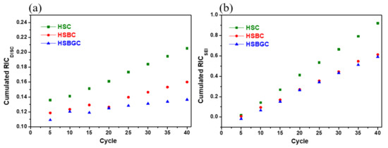 Cumulated relative irreversible capacities related to (a) electrical disconnection and (b) SEI for HSC, HSBC and HSBGC electrodes.