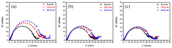 To better understand the capacity fading behavior of these electrodes, EIS measurements were performed on the fully charged electrodes. Nyquist plots for the HSC, HSBC and HSBGC samples, obtained after the 2nd, 10th and 20th cycles, are shown in Figure 9. The spectra consist of a depressed semicircle in the high frequency region and an oblique straight line in the low frequency region. The diameter of the semicircle indicates the charge-transfer resistance and might contain the SEI film resistance and inter-particle contact resistance [37,38]. As illustrated in Figure 9, the diameter of the semicircle in the HSC sample significantly increased after 20 cycles, whereas the diameter of the semicircle slowly increased in the HSBC sample. The HSBGC sample in particular exhibits a highly stable electrochemical reaction resistance up to 20 cycles. This is consistent with the observation in Figure 8, concerning the irreversibility for HSC, HSBC and HSBGC electrodes as a function of the cycle.