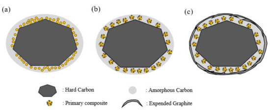 Hard carbon/Si–carbon black-carbon/graphite nano-sheet composite (HSBGC). HSBGC was obtained by encapsulating HSBC particles with graphite nanosheets/carbon mixture. The encapsulating process was performed by mixing HSBC particles and graphite nanosheets (Samjungcng Co., Ltd., Gyeongsan-si, Korea) in a carbon precursor (e.g., pitch) dissolved solution and then dried. This was followed with applying a mechanical shear force using a homemade agglomerator.