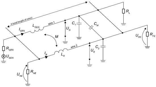 The model of the multi-conductor transmission line (MTL) based on [9] was used (see Figure 9). Computer simulations were conducted in CST Studio Suite 2019 [21]. Using the 3D editor, the nearest environment in which the wiring harness is located was defined, including electrical parameters and geometrical dimensions. Next, the cables, route of their laying, their structure and construction of surrounding screen were defined. Appropriate names were assigned to the ends of the wires. After selecting conductors and maximum distance between the wires to be taken into account, the whole bundle was divided into a finite number of simple segments. The program took into account the influence of metal objects in the vicinity of the ducts, finally defining the cross-section of each segment. The unit parameters of the transmission line (R’, L’, C’, G’) were calculated using a static 2D module. Finally, a sectional model of the line was created. Then, this model was imported into a built-in circuit simulator operating in the time and frequency domain. In the simulator, it was also possible to export the obtained model to an external program belonging to the SPICE family.