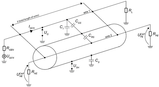 Shielding is one of the methods to protect electronic interfaces against sources of electromagnetic disturbances, such as indirect effects of lightning. Cable braided shield performance depends on many parameters, the impact of which is constantly studied [12,13,14]. Figure 2 shows the equivalent circuit for capacitive coupling in a shielded cable. The shield acts as a Faraday cage, hence both mutual capacitance between generator wire and receptor wire, and self-capacitance of receptor wire, are equal to zero and are not shown in the Figure 2. CGS is a mutual capacitance between generator wire and shield, while CRS is mutual capacitance between shield and receptor wire. Self-capacitance of shield is represented by CS, and USH is a shield voltage. The other symbols correspond to quantities as in Figure 1. Just as in the case of unshielded wire after deriving per-unit-length circuit parameters (ignoring self-capacitances C1 and CS), voltages at the ends of the receptor wire are given by (13)