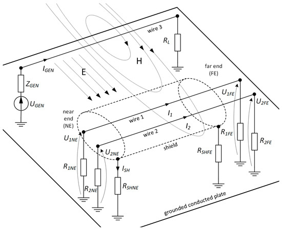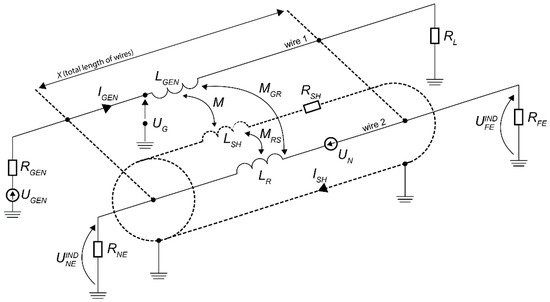 In the case of inductive coupling (for the circuit as in Figure 3), the shielding effect mainly depends on the self-inductance LSH and resistance RSH of the shield, assuming double-sided grounding of the shield. It is necessary to ensure the highest possible current flow in the screen to compensate induced voltage in the receptor wire inside it.