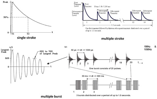 As a result of lightning discharges, electromagnetic disturbances can occur in aircraft systems, resulting in damage to avionics components or incorrect operation of these on-board systems, which in the worst case could be catastrophic. Therefore, it is required to conduct tests on the susceptibility of avionics systems to induced lightning transients. In the case of civil aircraft certification, one of the recommended standards is RTCA/DO-160, for which the lightning induced transient susceptibility test procedure is described in Section 22 [16]. There are three types of waveforms used during testing. They are single-stroke, multiple stroke and multiple burst pulses, the shapes of which are shown in Figure 4. They are intended to reflect indirect effects that may actually occur during lightning discharge to the aircraft.