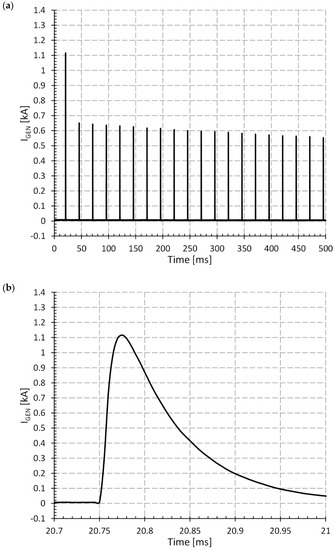 In the studied model, wire 3 was treated as the power cord, in which surge current flowed as a result of multiple stroke lightning. An aluminum sheet, 1 m wide and 2 m long, was placed under a two-meter section of the prepared cable line and connected to the PE grounding terminal in the laboratory room. The opposite ends of the cable harness were called NE (near-end) and FE (far-end). The impulse current forced in wire 3 consisted of the first stroke and 19 subsequent strokes, which were spaced equally by time interval of 25 ms. Data regarding the shape and level of the injected current pulses resulting from the selected generator settings, the impedance of wire 3 and conditions of the tested system were collected. In this case, the rise time for each pulse of the current surge was about 20 μs. Peak value was about 1.1 kA for the first stroke and about 0.6 kA for subsequent ones. All of the signal wire ends were terminated to the ground (metal plate) by the same resistors, with resistance about 69 Ω as in [9]. Two configurations of braided shield termination were considered. For case “A”, the shield was grounded only at near-end. For configuration “B”, both ends were connected to the GND. Figure 8 shows injected current waveform achieved for case A.