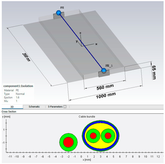 The cable bundle consisted of three LYc-L copper tinned wires, insulated with heat resistant PVC, marked in Figure 7 as “wire 1”, “wire 2” and “wire 3”. Wires “1” and “2”—with a core cross-section area of 0.35 mm2 and insulation thickness of 0.6 mm—were considered as signal wires. They were surrounded by tinned copper braided shield with a cross-sectional area of 3.4 mm2 (24 fibers with a diameter of 0.15 mm, 8 in the group and an angle of 15°). The third conductor “3”, with a cross-sectional area of 1.5 mm2 and 0.7 mm insulation thickness, was situated next to them.