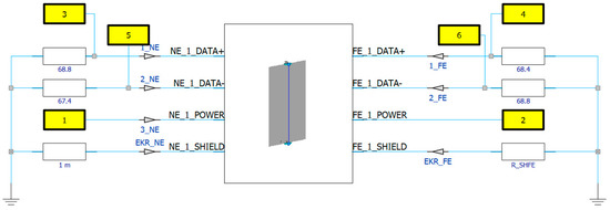 The ready circuit diagram is shown in Figure 10. The wiring harness and its surroundings in the form of a grounded metal plate were represented by automatically creating a block with eight terminals, whose names correspond to previously defined designations of conductors and their terminals, which were assigned to the ends of a line loaded in 3D. During the simulation, the effect of considering parasitic capacitance and inductance of the resistor at the ends of the line on the obtained results of calculations was examined. The parameters of the resistors correspond to those in the experimental model, which were measured with the LCR bridge.