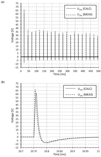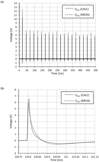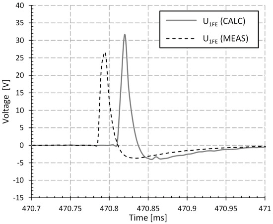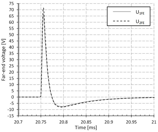 In Figure 12 and Figure 13, a comparison of experimental and simulation results was made for a selected point in the circuit for condition A. There was the voltage of wire 1 at far-end, while the shielding braid was grounded at only one end. The nature of the changes in both the measured and calculated waveforms is similar. The first stroke was observed with a higher peak value and 19 subsequent ones with a maximum value that was lower by about half. No significant reflections were detected.