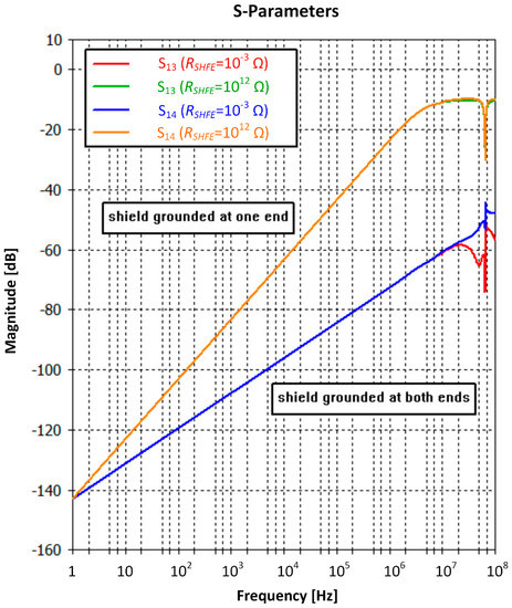 Each of the matrix parameters has its own physical interpretation. S-parameter analysis can provide information about attenuation, reflections and line crosstalk [21,22]. The influence of shield grounding resistance RSHFE at far-end on S13 and S14 S-parameters, for shield grounding at near side by low resistance, was shown in Figure 15. Observations of S13 and S14 in frequency domain allowed for the determination of approximately near and far crosstalk between conductor 3 (aggressor) and conductor 1 (victim). In this case, the use of properly grounded cable screen means up to 50 dB lower levels of induced voltages than in the case of one side grounding.