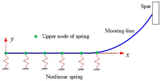 During the dynamic response, the nodes of the mooring-line elements that may touch seabed are connected with the nonlinear spring elements. Those springs can only provide forces in the y direction (Figure 2), and the values of the stiffness coefficients (k) are 0 and 1.0 × 105 N/m for Y > 0 and Y ≤ 0, respectively. The value, 1.0 × 105, is chosen so that the spring element is able to simulate the seabed action without causing matrix singularities. Additionally, Y represents the coordinate position of the upper node of each spring. When the mooring-line moves away from the seabed, the supporting force will be zero. On the contrary, the spring will take its supporting effect when the mooring-line touches down the seabed. As the effect of elastic support of the seabed is the main factor affecting the tension of mooring-lines, the bottom friction is not included here.
