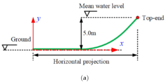 The dynamic responses of a catenary mooring-line caused by the spar motion (spar surge in x-direction, as shown in Figure 4b) are calculated firstly in this section. As the environmental wave periods mainly range from 5 to 20 s, the frequency of spar surge is selected as 0.1 Hz, and three amplitudes, i.e., 4 m, 5 m, and 6 m, are considered. The mooring-line dynamics, i.e., the inertial and damping effects, along with the interaction between seabed and mooring-lines, are included in the numerical simulations.
