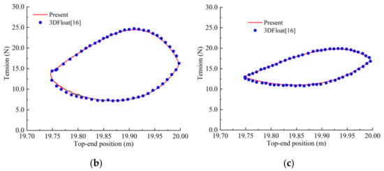 To verify the established numerical model, the dynamic responses of a catenary mooring-line (Figure 3a) caused by top-end motion are calculated. The catenary parameters are listed in Table 1 [16], and top-end surge (x-direction, as shown in Figure 3a) is considered, of which the surge amplitude is 0.125 m, and surge periods are 3.16 s and 4.74 s. Figure 3b,c presents the comparison between the calculated top tensions and the results of 3DFloat [16], which is a code for the modelling of floating offshore wind turbines. Compared to 3DFloat, where the rotor is modelled as rigid with no interaction between the rotor and the tower, in our model, all the components, such as rotor and tower, are modelled as flexible bodies, and the coupling between these components can be included. From Figure 3, it can be seen that the predicted tensions agree well with 3DFloat, where the direction of the displacement-tension phase curves shown in Figure 3b,c are clockwise.