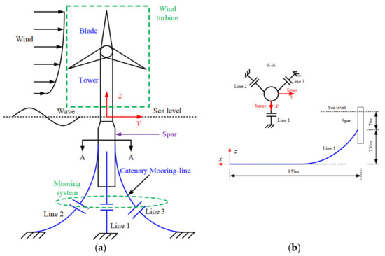 Schematic of the floating wind turbine system. (a) The wind turbine model; (b) Schematic of mooring-line.