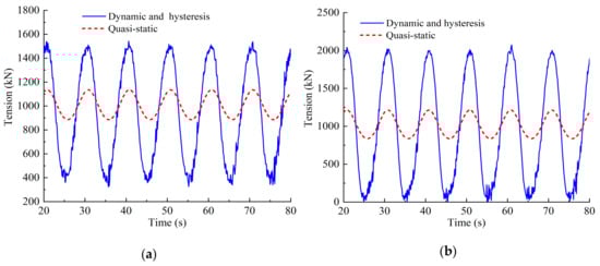 The top tension series of Line 1 (Figure 4b) is shown in Figure 5. The tensions with its dynamics and hysteresis under consideration are compared with the quasi-static ones. It is seen that, owing to the mooring-line hysteresis, the tension gets larger, and it increases with the increase of the spar-surge amplitude. For example, the maximum tension and tension amplitude are respectively 1.6 and 5.3 times larger than the quasi-static values. It should also be noted that under large float movement, the mooring-line may slack, or the minimum tension is approaching zero, as shown in Figure 5b.