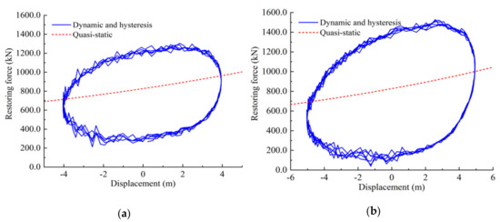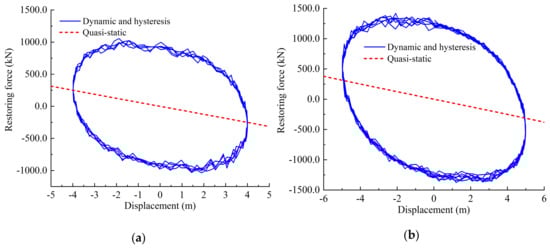 Figure 7 shows the restoring stiffness curves of the whole mooring system (including the three mooring-lines shown in Figure 3), and the quasi-static restoring forces are also presented as a comparison. Similar to the result of the single mooring-line, the stiffness with dynamic and hysteresis behaves quite different from the static, which is directionally dependent on the spar velocities. And interestingly, the restoring force may be in the opposite direction, though the surge displacements are the same, e.g., when the spar displacement is 3.0 m, the corresponding restoring forces are −860 kN and 550 kN for two opposite velocity directions (Figure 7a). That is, the restoring force depends on not only the spar displacement but also the spar velocity. Moreover, due to the damping effect coming from the structure and the fluid of the mooring-line, the restoring force produces significant hysteresis, and the restoring stiffness curve shapes approximately as an ellipse loop.