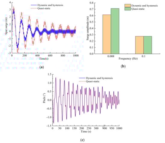 In this section, two excitation frequencies with two wave heights are considered, i.e., the wave periods are 10 s and 13.3 s, and the corresponding wave heights are 3.0 m and 14.4 m, respectively. To evaluate the impacts of mooring-lines hysteresis on wind turbine responses, the responses under quasi-static restoring force are also calculated as a comparison. The dynamic responses of the wind turbine are simulated during 1000 s time duration, and the incident wave direction is along with the surge direction of the spar (x-direction, as shown in Figure 4b).