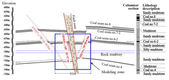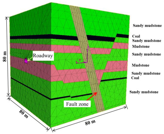 The stress boundary was set according to the stress testing result near the fault zone, and the analysis on the stress field of this zone. The vertical in situ stress on the top boundary was set to 19 MPa, while the horizontal stresses parallel and perpendicular to the roadway were set to 28 MPa and 15 MPa, respectively. The displacement boundary condition was defined as follows: (1) the bottom boundary of the model was fixed to restrict vertical displacement; (2) the top boundary was free; and (3) the side boundary was fixed to restrict horizontal displacement.