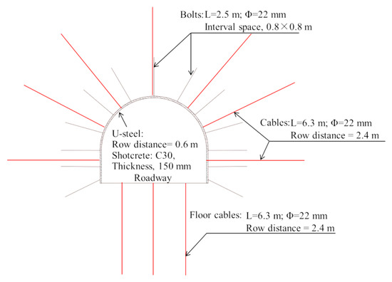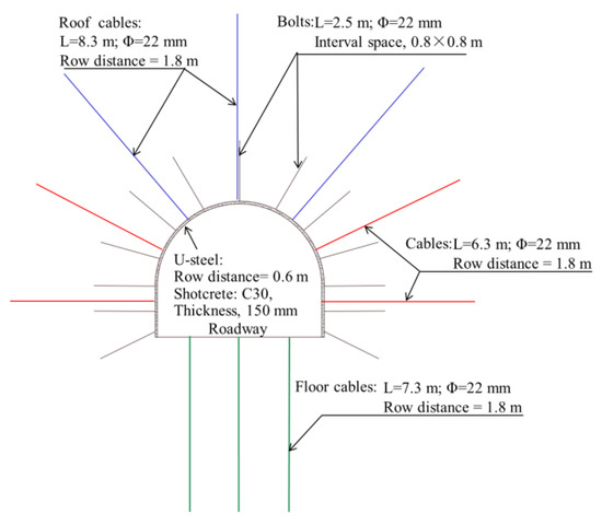 Figure 8, the ordinary supporting structure contained bolts, cables, and lining (composed of U-steel support and shotcrete, the grade of steel was 20 MnK with tensile strength > 490 MPa, yielding strength > 335 MPa, and elongation > 16%). The diameter and length of the bolts were 22 mm and 2.5 m, respectively. Interval space was set to 0.8 × 0.8 m. The diameter of the cables was 22 mm, and the length was 6.3 m. The row distance of the cables was 2.4 m. The floor was reinforced by three cables in each section, and the row distance was set to 2.4 m. Pre-forces of bolts and cables were set to 20 kN and 180 kN, respectively.