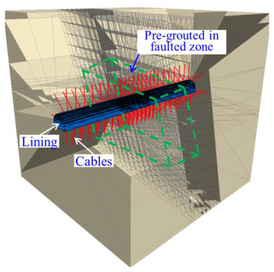 Figure 9. Pre-grouting was introduced in the improved supporting method. Broken rock mass in the fault zone was reinforced by pre-grouting prior to excavation. The hexahedron zone with size of 30 × 30 × 15 m was treated as the grouted region (