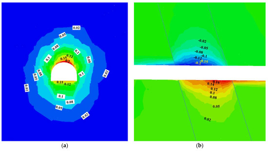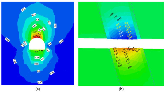 Figure 9 plots the vertical displacement of the surrounding rock in the fault zone, indicating discontinuous features of the displacement field. It can be attributed to the failure of interfaces between rock blocks.