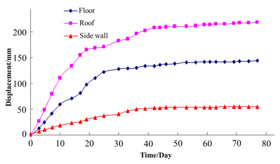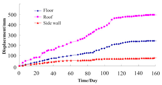 Figure 12). We could see that the monitoring displacement continued to rise gradually during the 160 days following the excavation. The maximum roof sag exceeded 500 mm, and the floor heave reached nearly 300 mm.