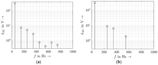 Four validation data sets with different multi-frequent voltage distortions on the grid-side of the PV inverter are applied. Different amplitudes and phase angles were chosen for the distortion components, which represent a considerable deviation from the single-frequent data used for training purposes. The chosen amplitudes considered typical voltage distortion levels in LV networks, e.g., a noticeable presence of 3rd, 5th, 7th and/or 9th order harmonics [31]. This voltage distortion complies with the standards, e.g., the EN 50160. Figure 3 shows the amplitude spectra of the four validation data sets.