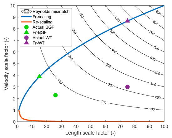 The Reynolds mismatch (reduction with regard to full-scale) as a function of the length and velocity scale factors. The blue and orange lines correspond to the Froude and Reynolds scaling, respectively. Markers show the Blue Growth Farm (BGF) model scaling (green) and wind tunnel model scaling (purple), with “Fr-x” corresponding to the scale factors where Froude scaling was used and “Actual x” corresponding to the adopted scale factors.
