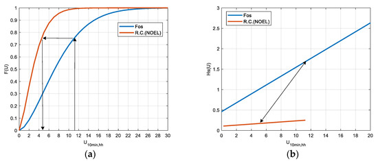 Comparison between the full-scale deployment site (Fos) and test site at Natural Ocean Engineering Laboratory (NOEL) (R. C.) in terms of the wind speed cumulative distribution (a). Significant wave height Hs as a function of the wind speed (b). U10min,hh is the 10-min mean hub-height wind speed.