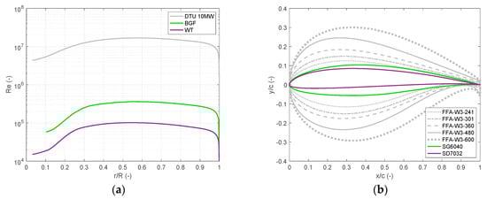 The main aerodynamic-related problem arising from scaling is Reynolds number mismatch. The chord Reynolds number for the BGF and WT rotors at their respective rated operating points are shown in Figure 3a. As seen, it is around two orders of magnitude less than for the full-scale wind turbine. To cope with this issue, a new airfoil is selected, and the blade chord and twist distribution is modified. The scale model airfoil is selected according to the operating Reynolds range. Low-thickness airfoils are selected to replace the high-thickness airfoils of the full-scale rotor. The airfoil must have a good lift-to-drag ratio, soft-stall behavior and a linear lift coefficient. One single airfoil or more airfoils can be used along the blade span. Some examples are RG-14, AH79-100C, WM006 and SD7032, SG6040 and SG6041. The airfoils for the BGF and WT models were selected among those of the database “Low Reynolds airfoils” [41]. The low thickness results in a reduced sensitivity to the flow separation at low Reynolds numbers, which translates into a greater lift-to-drag ratio than what would be achieved with a conventional blade profile. The nondimensional shape of the two model airfoils is compared to the one of DTU 10 MW blade (i.e., FFA-W3-xxx) in Figure 4b. It is possible to see that the airfoil selected for the BGF rotor has a higher compared to the WT airfoil. A higher thickness airfoil was selected for the BGF blade, because the expected loads are greater than in a small-scale wind tunnel model, and the Reynolds number is higher thanks to the larger dimensions of the blade.