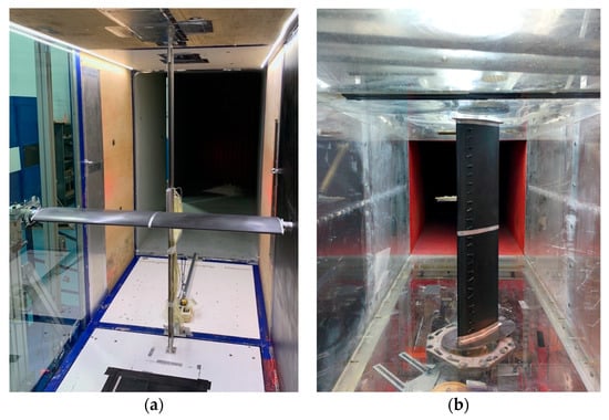 Two-dimensional sectional model tests of the SG6040 airfoil (a) and of the SD7032 (b). In both models, the pressure loop is seen at the midspan and the wake rake downstream of the test section.