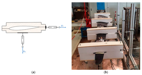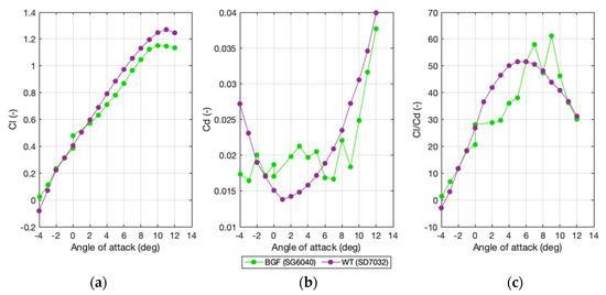 The chosen profiles were further characterized through wind tunnel tests on a 2D section model of the airfoil to define the aerodynamic coefficients in a range of Reynolds numbers that is not covered by the literature. Moreover, low-thickness airfoils are sensitive to local separation phenomena and to freestream turbulence. Two-dimensional sectional model tests were carried out with an increased inflow turbulence to simulate the rotor-sampled turbulence seen by the wind turbine model blades; the 2D sectional model was manufactured with similar materials and the production process adopted for the 3D blade, so to have the same surface roughness. The experimental setups for the BGF and WT airfoils are depicted in Figure 4. The lift force was measured with a pressure loop at the model midspan, whereas the drag force was obtained from the wake deficit, which was measured by means of a wake rake positioned downstream of the leading edge. The aerodynamic coefficients of the SG6040 and of the SD7032 that were measured for a Reynolds number of 150,000 are reported in Figure 5. The airfoils behave similarly for small values of the angle-of-attack (AoA), where the lift coefficient is linear and of similar slope. The stall AoA for the SG6040 is slightly lower than for the SD7032, which also shows a larger lift-to-drag ratio. In the BGF blade, aerodynamic performance is traded for structural performance.