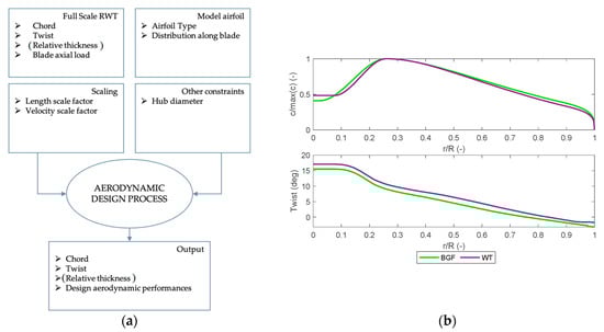 (a) Flow chart of the blade design process (b). Normalized chord and twist distribution of the outdoor prototype (BGF) and the wind tunnel model blade.