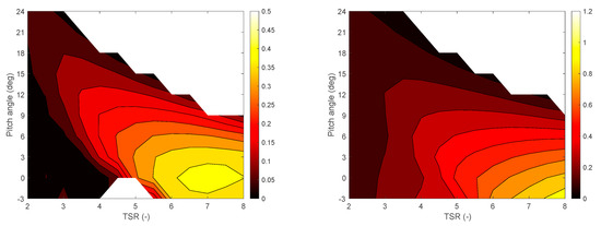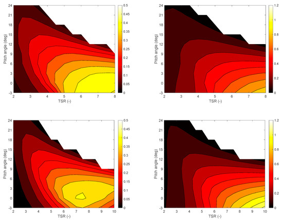 Power coefficient (left) and thrust coefficient (right) of the DTU 10 MW (top), BGF scale model (middle) and WT model (bottom) from the BEM calculations for several values of the tip–speed ratio (TSR) and blade pitch angle. Negative values are omitted.