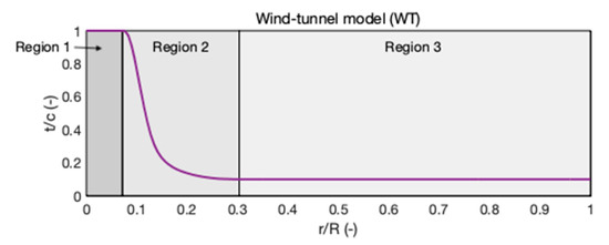 The radial extension of Region 2 is optimized to have the first flapwise frequency of the scale model blade matching the scaled frequency of the full-scale blade. The radial position where Region 2 starts (i.e., the innermost) is fixed, and the optimization routine searches for the position where Regions 2 ends to minimize the absolute difference between the natural frequency of the first-flapwise mode for the scale model blade and the scaled frequency of the full-scale blade. The optimization routine is the unconstrained nonlinear programming solver fminsearch of MATLAB (The MathWorks, Natick, MA, USA). The natural frequency of the scale model blade is defined based on an Finite Element beam model; the target frequency is obtained from the DTU 10 MW specifications and the frequency-scale factor of Table 2. The radial distribution of the nondimensional thickness for the wind tunnel scale model is shown in Figure 8.