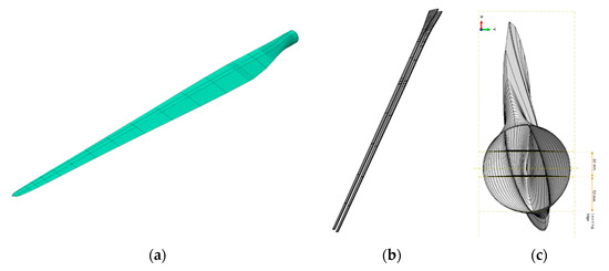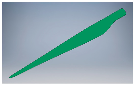 The final 3D external design of the blade is depicted in Figure 12. Two shear webs were inserted along the blade axis to enhance the resistance of the blade to buckling, and they extended from the section at a radius of 0.09 m to the section at a radius of 2.19 m. The blade structure is modeled on the commercial FE software ABAQUS CAE to build a preliminary structural model.