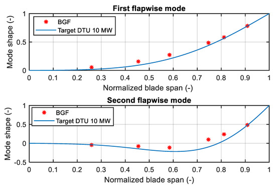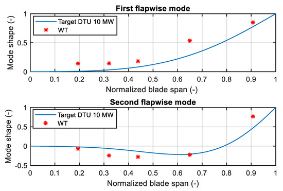 Experimental and target (DTU 10 MW) first and second flapwise modes.