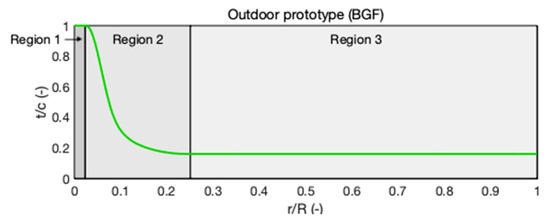 The output of the aerodynamic design for the BGF model is the external shape of the blade. The relative thickness was defined as for the WT model, distinguishing between the three regions presented in the previous section: the aeroelastic design was not the primary goal, and the width of the transition region (Region 2) was defined in order to have the minimum stiffness permitted by the structural design (see Figure 11).