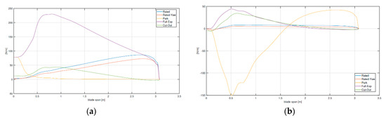 Each load case reported in Table 6 is characterized by four parameters: wind speed, rotor speed, collective pitch and yaw angle. These load cases were simulated in FAST (NREL, Denver, CO, USA), and the loads obtained on each section of the blade, normal and tangential to the rotor plane, were applied to the FE model in ABAQUS to define the stresses and deflections. The distribution of aerodynamic loads per unit length on the blade span for the load cases listed in Table 6 is reported in Figure 13, whereas the resultant blade–root loads are reported in Table 7.