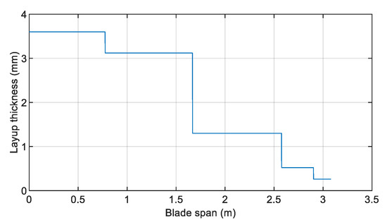 The “full-exposure” case, being the most demanding from the structural point of view, was chosen for dimensioning the layup thickness. The blade–root region carries most of the loads, and the layup thickness is driven by the structural resistance requirements. The tip region does not contribute much to the overall structural resistance; hence, the layup was tuned to match the mass and inertia of the blade. Finally, shear webs have a constant thickness along their span to ease blade manufacturing. The final shell layup thickness is reported in Figure 14.
