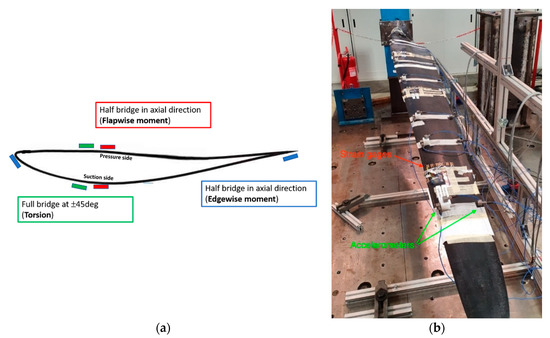 Strain gages arrangement on a blade section (a). Strain gages and accelerometers along the blade (b).