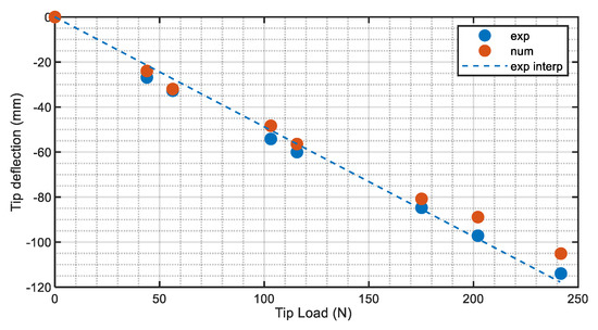 Two are the main outcomes of the static test: one side the blade is tested with respect to the design loads, and its resistance is assessed; on the other side, the experimental data can be used to verify the FEM model of the blade. The validated FEM model is then utilized to assess the blade resistance with a more realistic continuous-load distribution. To verify the fidelity of the FEM model, the blade is loaded with a force in the flapwise direction at the tip, and the tip displacement is measured for several load values. A comparison of the experimental data and FEM model predictions is shown in Figure 17.