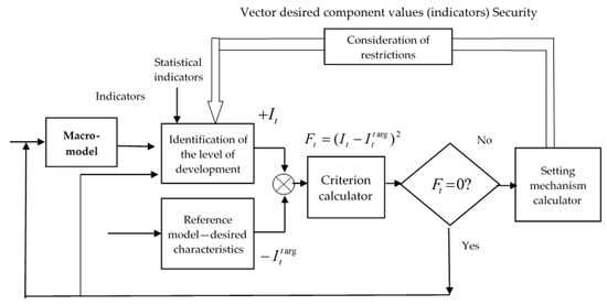 Strategizing: goal setting—defining strategic goals; construction of the future trajectory of the desired development; synthesis of strategic landmarks of components and indicators of the security object through the decomposition of integrated indices using adaptive control methods from management theory [29]; and implementation of the “de-norming” procedure—the transition from dimensionless indicators to macro indicators in natural units.