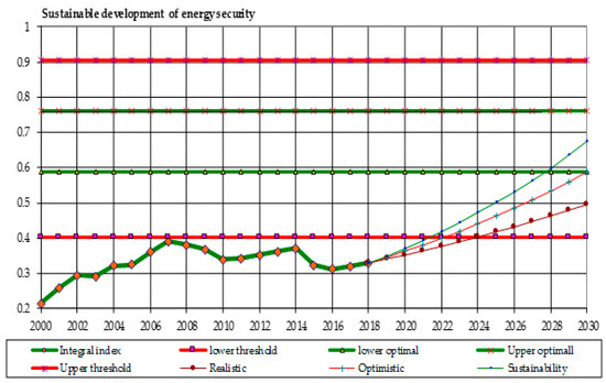 Thus, the comparison of integral indices with integral threshold values translates the concept of “development” into the concept of “security”. Moreover, the developed method of estimating the level and strategy of energy security becomes instrumental in shaping the goals of energy policy, as it will justify strategic decisions in the field of energy based on quantitative assessment of their impact on the country’s national security and sustainable development. The application of a systemic approach, together with estimating long-term perspectives of science, technology, economy and society, strategic directions of research, and new technologies (of classical foresighting), with the methodology of identification in the security dimension and strategizing based on the principle “the future is determined by the future trajectory” eliminates existing shortcomings and provides new opportunities not only for the definition of long-term factors and trends, but also for the scientific construction of the desired future—that is, the creation of a tool for scientific and strategic foresighting.