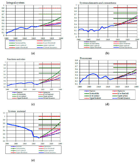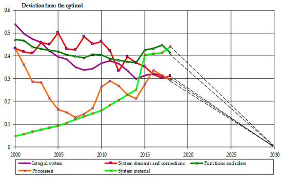 It should be noted that such components (Figure 2) as the integral system and the system’s elements and links have a steady positive tendency to approach the target values. At the same time, the dynamics of other components of the systemic description of energy security functions and roles, processes, and material of the system reflect instability in achieving the strategic goals of energy security. Moreover, there is a significant deterioration of the integrated index component, which reflects the quality of the system’s material (technical condition of power engineering, consistency and quality of energy policy, and compliance of decision-makers with their positions in the management system).